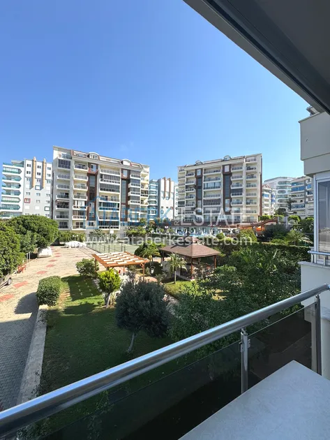 Квартира планировки 2+1 площадью 110 м² расположена на первом этаже и предлагается с мебелью. В планировке предусмотрены гостиная с кухней открытого типа, две спальни, один санузел и один балкон. Пространство светлое и функциональное, идеально подойдёт для семьи или отдыха у моря.