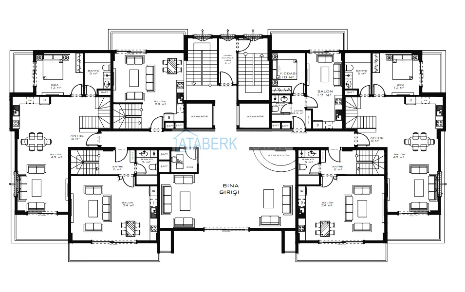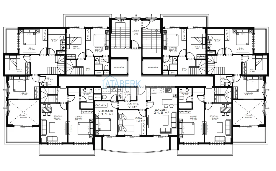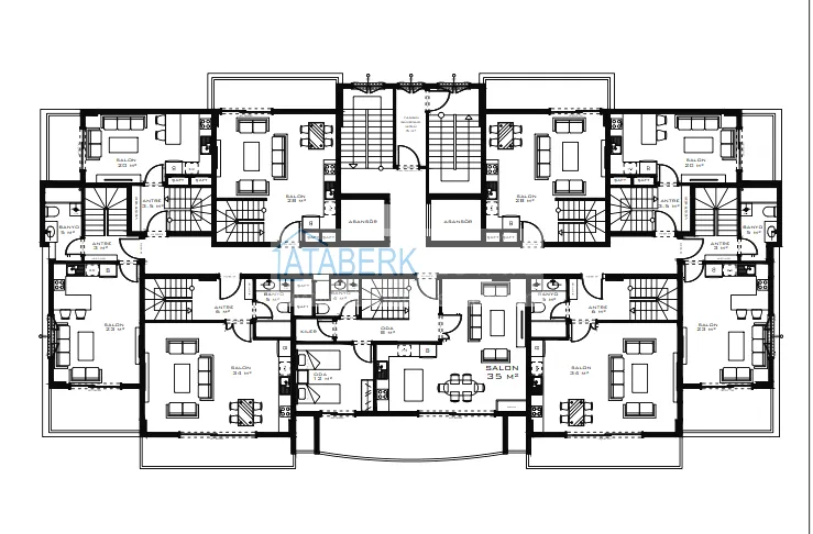 Типы апартаментов: стандартные 1+1 и двухуровневые общей площадью 46 кв. м, 2+1 от 82 до 92 кв. м, пентхаус-дуплексы 2+1 и 3+1 от 132 до 210 кв. м. Жилые этажи начинаются с 3-го. Квартиры будут сданы с полной чистовой отделкой, укомплектованными санузлами, установленной сантехникой, водонагревателем и кондиционерами.