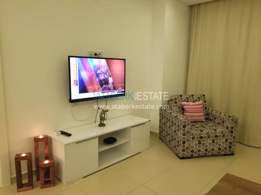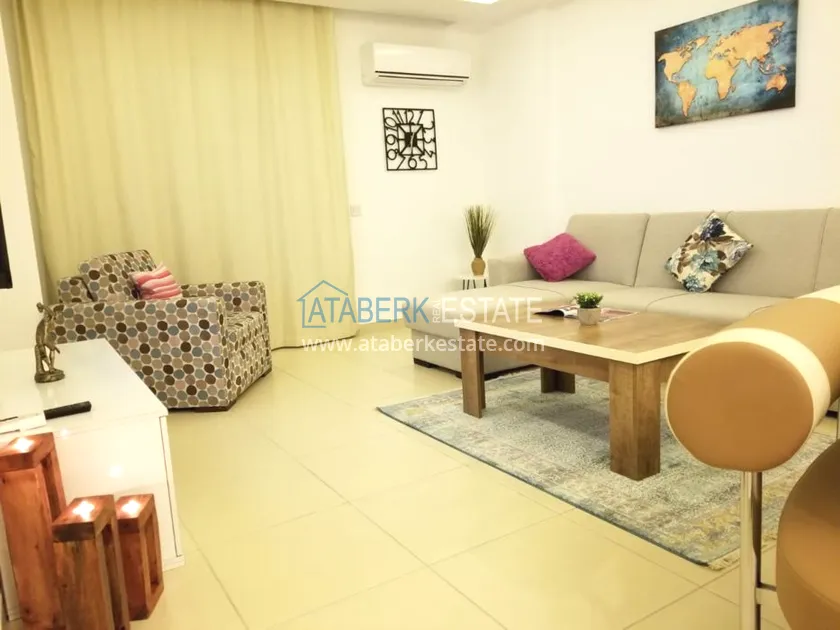 Апартаменты расположены на 1 этаж, ориентированы запад, окна выходят на территорию комплекса. Общая площадь составляет 68 кв. м, планировка 1+1. Внутри: гостиная, открытого типа кухня, одна спальня, совмещенный санузел и одни балкон. Квартира выставлена на продаже со всей мебелью и техникой, все как на фото.