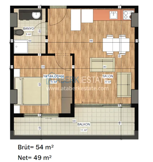 Предложена квартира планировки 1+1, 2 турецкий этаж (фактически 4), восточная сторона света, общая площадь 54 м2. В стоимость уже включена полная чистовая отделка, встроенная кухонная мебель и укомплектованный санузел. В планировку двухкомнатная квартиры входит: салон, совмещенный с кухней американского типа, одна спальня, ванная комната и балкон.