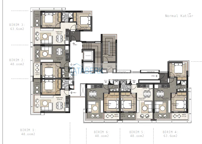 В проекте 41 квартира. Предложены следующие планировки: 1+1 площадью 48 м2, 2+1 площадью 64 м2, садовые дуплексы 2+1 и 3+1 площадью 102-145 м2, а также пентхаусы 2+1 и 3+1 площадью 97-143 м2. Технические характеристики: полная чистовая отделка с использованием высококачественных материалов, кухонная мебель с гранитно-мраморной стойкой, окна и двери ПВХ со специальными теплоизоляционными стеклами, ламинированные полы, стальные входные двери, видеодомофон, установка выводов под кондиционеры во всех комнатах, американские панельные межкомнатные двери, стеклянные ограждения на балконах, система горячего водоснабжения, проточный водонагреватель, а также полностью укомплектованные санузлы.