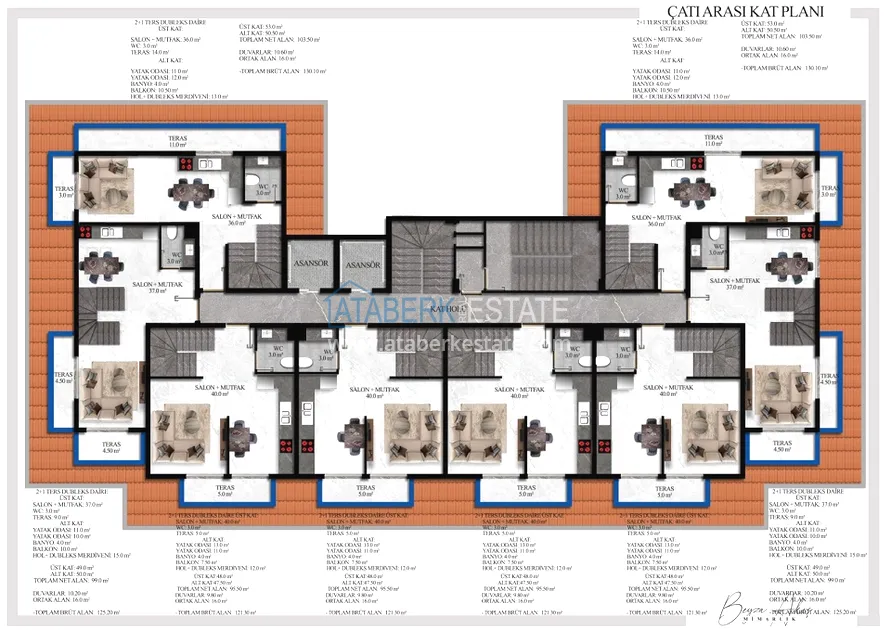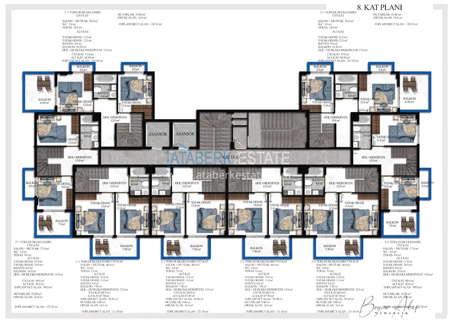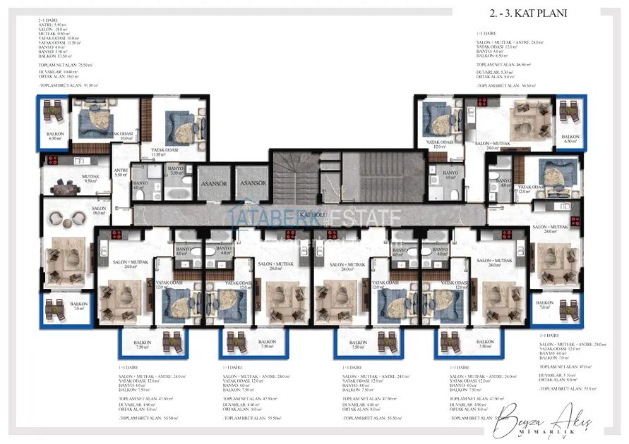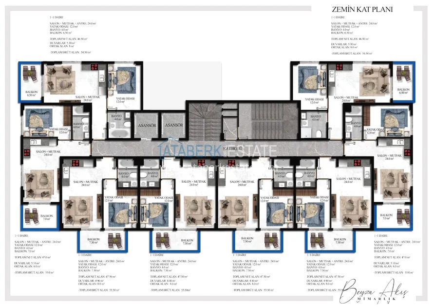 К продаже предложены квартиры двух планировок 1+1 и пентхаусы 2+1 площадью от 54 до 130 м2. В стоимость апартаментов включено: чистовая отделка, стальная входная дверь, выходы под кондиционер, встроенная кухонная мебель, укомплектованные ванные комнаты.