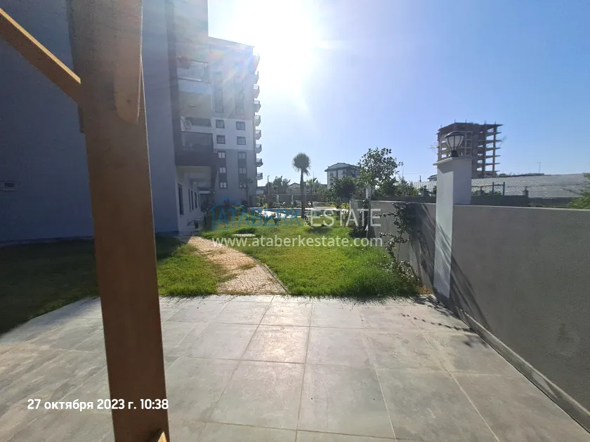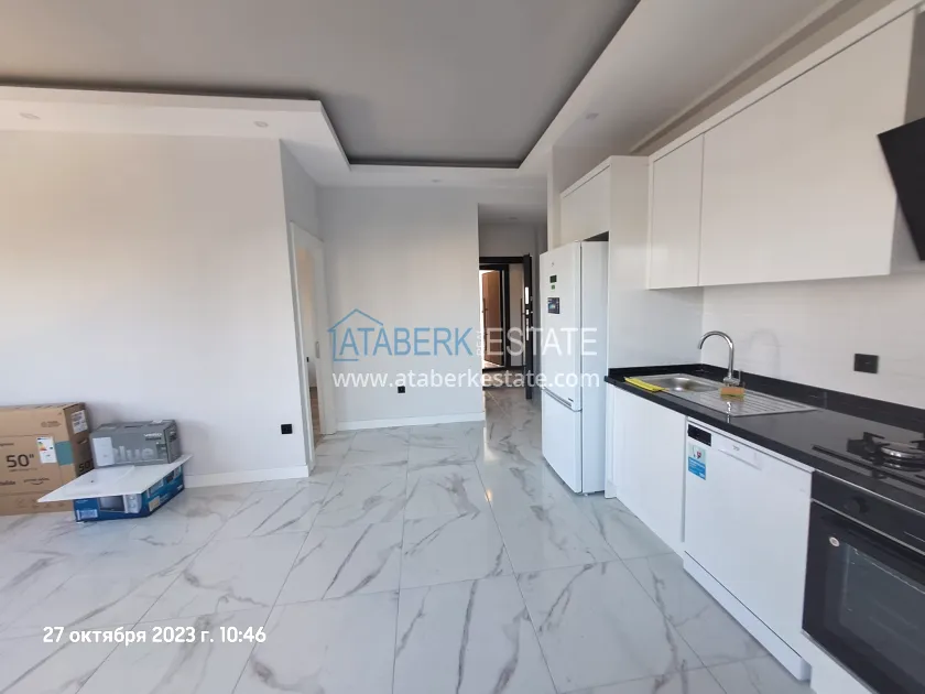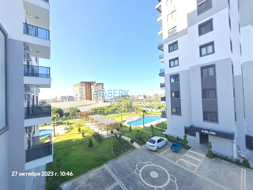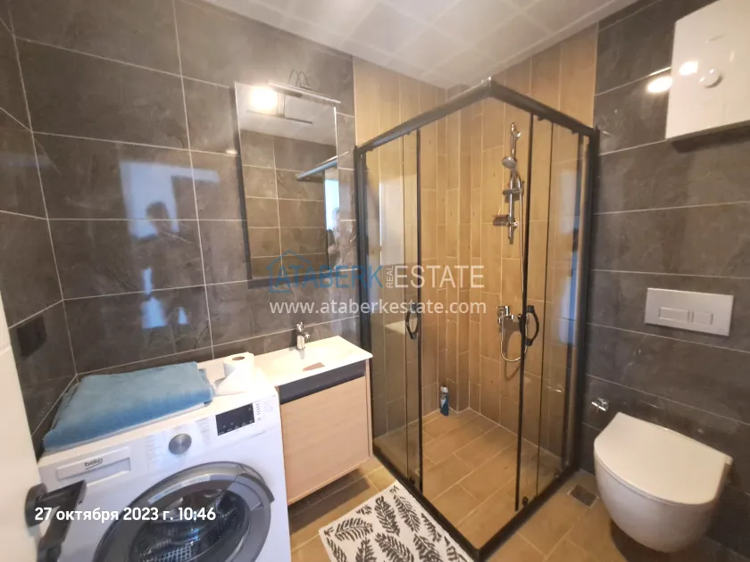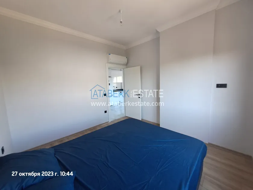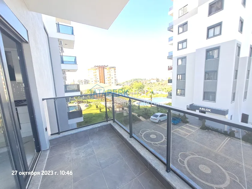 Предлагаемая квартира угловая, планировки 1+1 общей площадью 55 м2 расположена на 2 жилом этаже (турецкий первый), ориентирована на юго- запад и север. На данной площади разместились: салон, совмещённый с кухней американского типа, спальня, ванная комната и балкона с видом на территорию комплекса, бассейн, и частично на море. В апартаментах установлена кухонная мебель с комплектом бытовой техники, также есть кондиционеры и водонагреватель. В спальне есть кровать, а на полу уложен ламинат. Санузел полностью укомплектован.