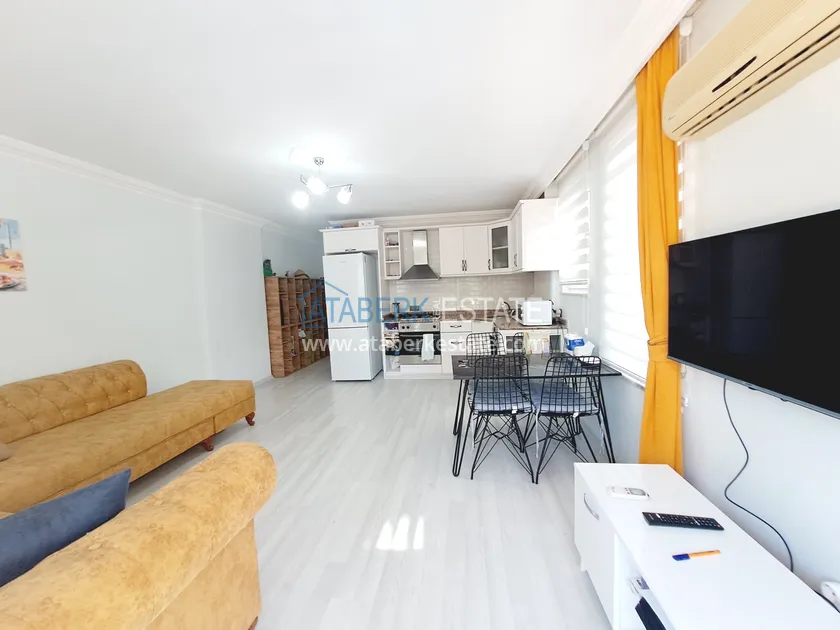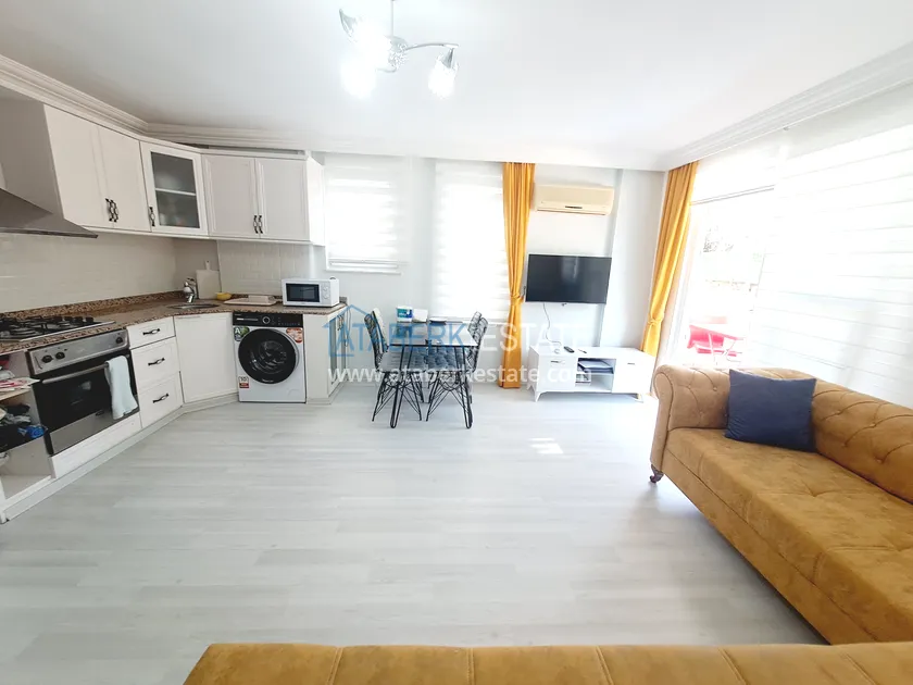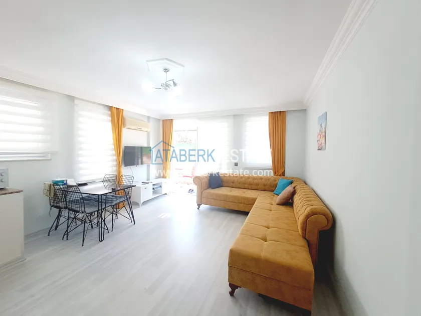 Квартира расположена на высоком первом этаже (этажность по турецкой системе — нулевой). Планировка включает гостиную с кухней открытого типа, отдельную спальню, ванную комнату и два балкона. Общая площадь — 70 м², что обеспечивает дополнительное ощущение простора, особенно по сравнению со стандартными планировками в новых жилых комплексах. Квартира меблирована, чистая и ухоженная, полностью готова к проживанию.