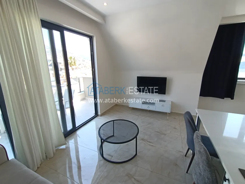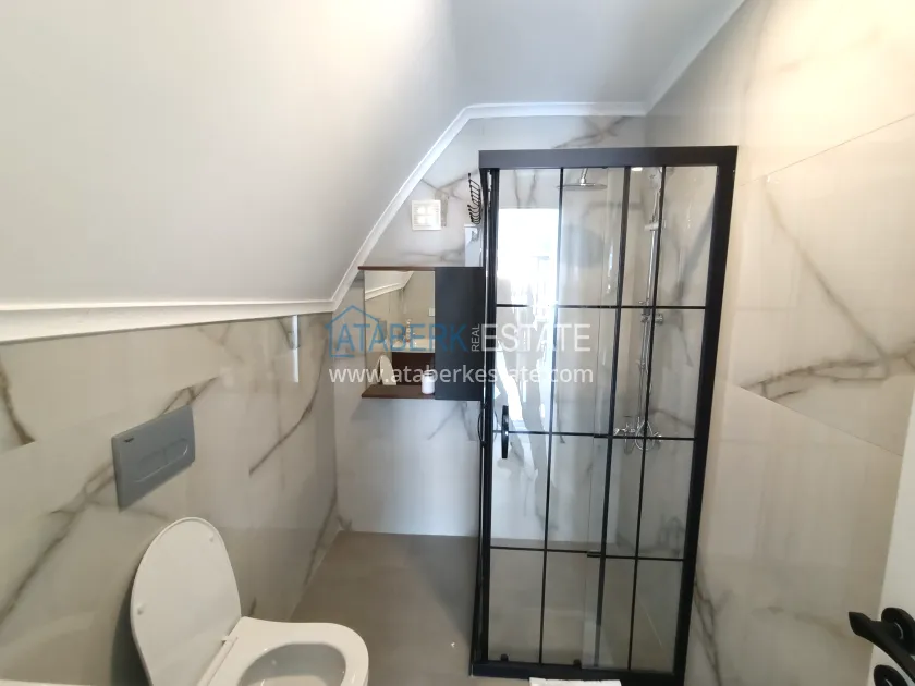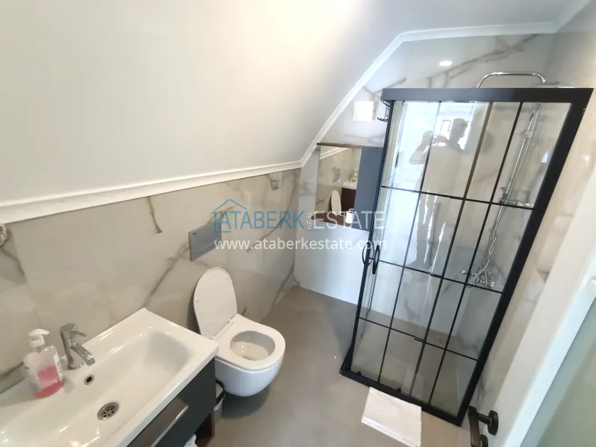 Дуплекс планировки 2+1 общей площадью 127 м² (93 м² чистой), расположенный на верхних этажах дома. В планировке: салон с кухней открытого типа, две отдельные спальни, три санузла и два балкона. Из окон открывается живописный вид на горы. Квартира представлена к продаже с полным набором крупной бытовой техники.