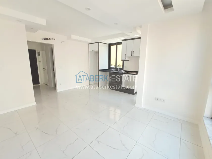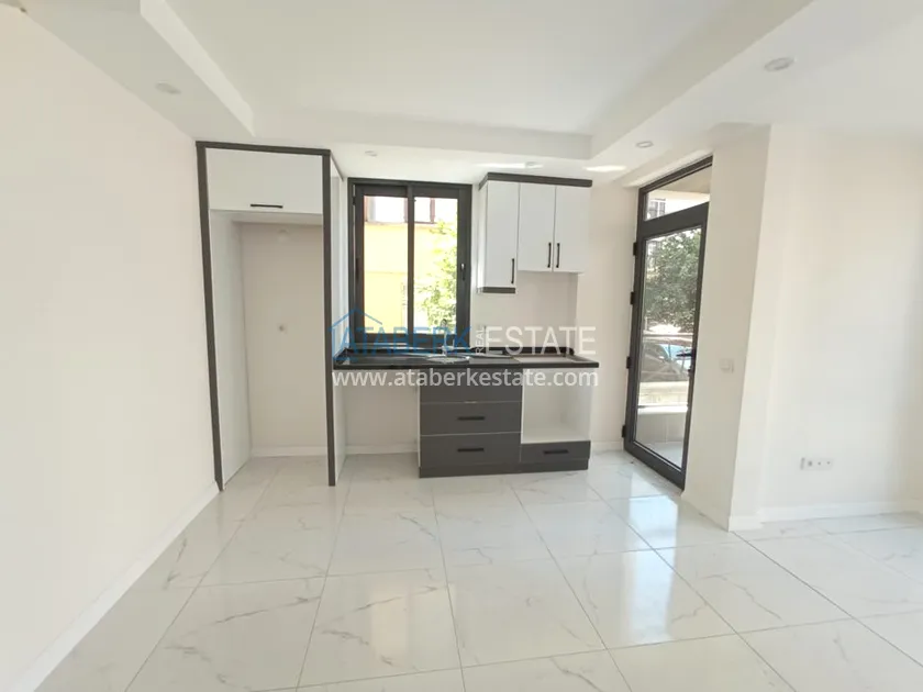 В доме всего 4 этажа, есть огороженная придомовая территория. Айдат 50 лир в месяц. Предлагаемые апартаменты угловые, находятся на первом этаже, планировка 1+1, общая площадь составляет 60 м2 - салон, кухня американского типа, одна спальня, совмещенный санузел и один балкон. Квартира новая, в ней никто не жил. В стоимость включена кухонная мебель, есть выходы под кондиционеры, домофон, встроенный шкаф в прихожей и водонагреватель.
