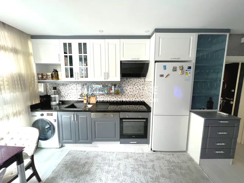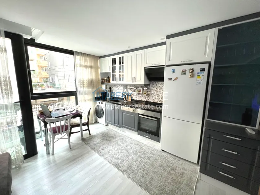 Квартира находится на 1 этаже, общая площадь составляет 60 м2, планировка 1+1 - салон, совмещенный с открытой кухней американского типа, одна спальня, одна ванная комната и два балкона. Есть небольшая прихожая. Апартаменты выставлены на продажу со всей мебелью и бытовой техникой, как на фото.
