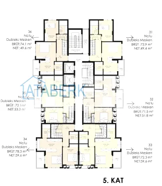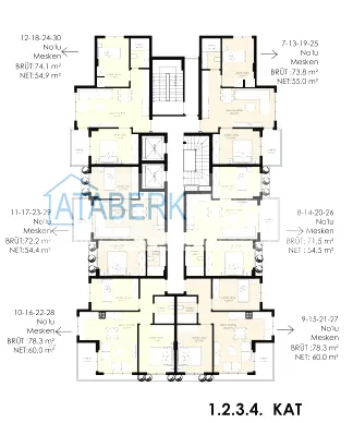 На выбор представлены квартиры следующих планировок: лофт 1+1 площадью 78,1 – 80,4 м2, стандартные 2+1 площадью 73,8 – 78,3 м2, дуплексы 2+1 и 3+1 площадью 133,2 – 153,9 м2. Комплектация апартаментов: полная чистовая отделка, стальная входная дверь, видеодомофон, встроенная мебель на кухне, пакет бытовой техники (стиральная машина, посудомоечная машина, холодильник, духовой шкаф, варочная поверхность и вытяжка), полностью укомплектованные санузлы с системой теплый пол, водонагреватель, подвесной потолок, споты, покрытие пола: жилые комнаты – ламинат, в остальных керамическая плитка.
