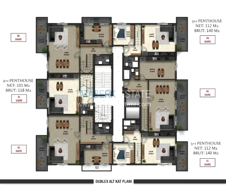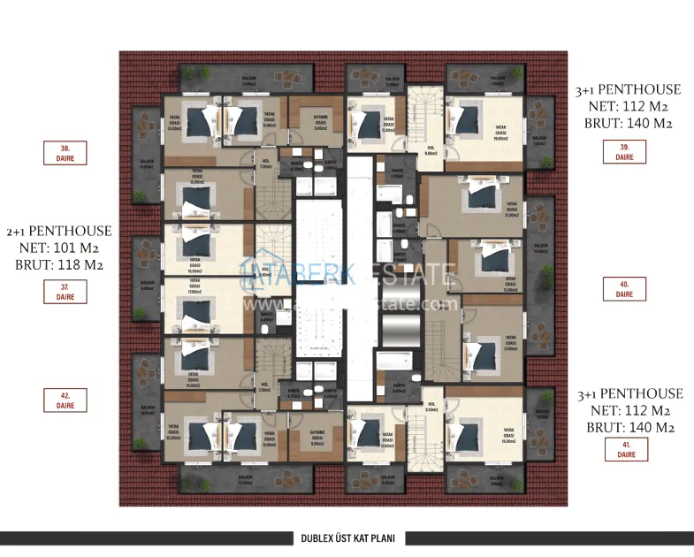 В комплексе одни блок в 7 этажей на 21 апартаментов – двухкомнатные квартиры планировки 1+1 площадью 59 м2, трехкомнатные 2+1 площадью 66 м2 и двухуровневые пентхаусы 2+1 и 3+1 площадью 118 и 140 м2. Все квартиры с полной чистовой отделкой, встроенной кухонной мебелью, качественной сантехникой и укомплектованными санузлами. Компания-застройщик сделала акцент на качественную, дорогую не только внешнюю, но и внутреннюю отделку комплекса.