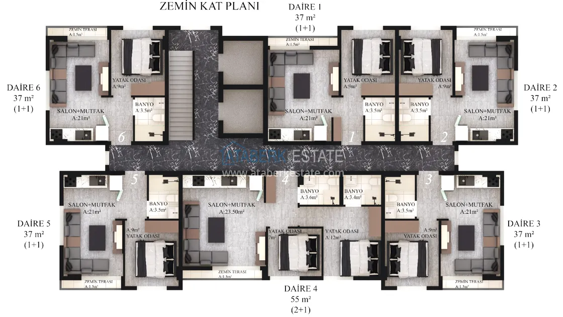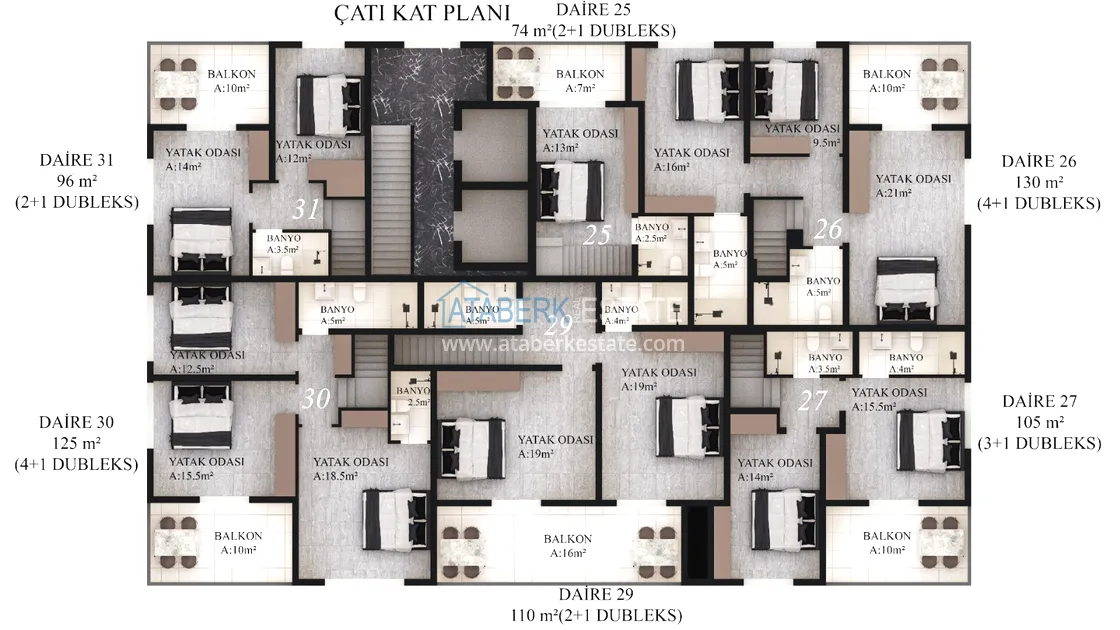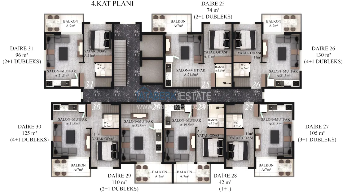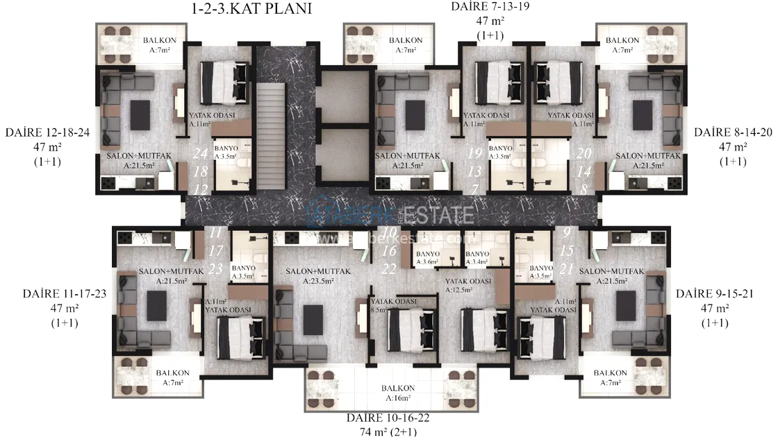 Планировки к продаже: 1+1 квартиры с площадью 47 м2. 2+1 квартиры с площадью 74 м2. Двухуровневые пентхаусы 2+1 и 3+1 с площадью 74 и 105 м2.