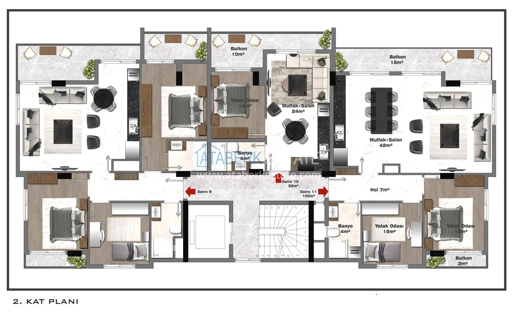 Предлагаемая квартира имеет планировку 3+1 и площадь 110 м2, этаж расположения 3-й (турецкий 2-й). На данной площади разместились – салон, объединенный с кухней американского типа, три спальни, одна ванная комната и три балкона. В стоимость включено: стальная входная дверь, шкаф в прихожей, керамический пол, окна из ПВХ с двойным остеклением, качественная сантехника, корпусная мебель на кухне и в ванной комнате, межкомнатные двери, выходы под кондиционеры и внешние жалюзи на окнах.