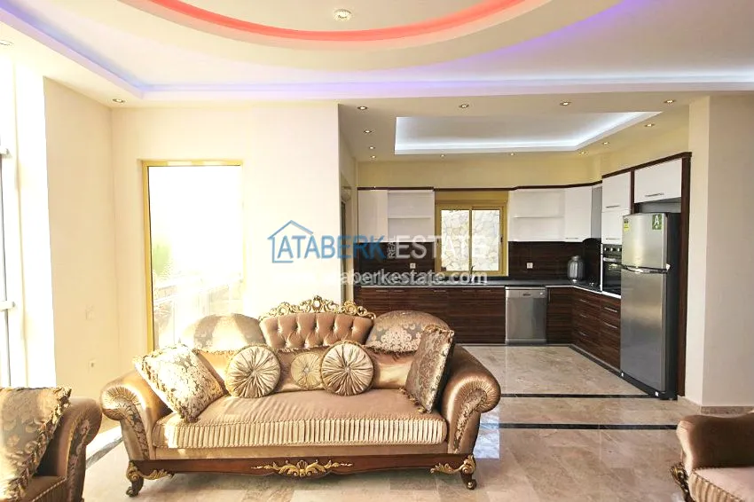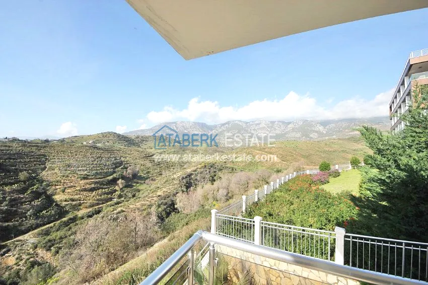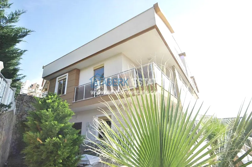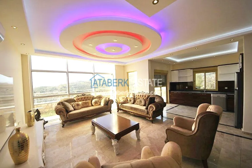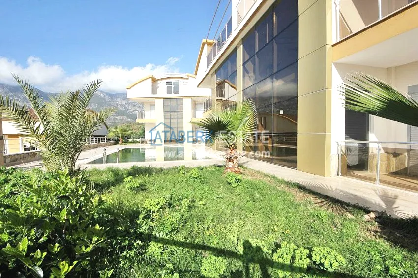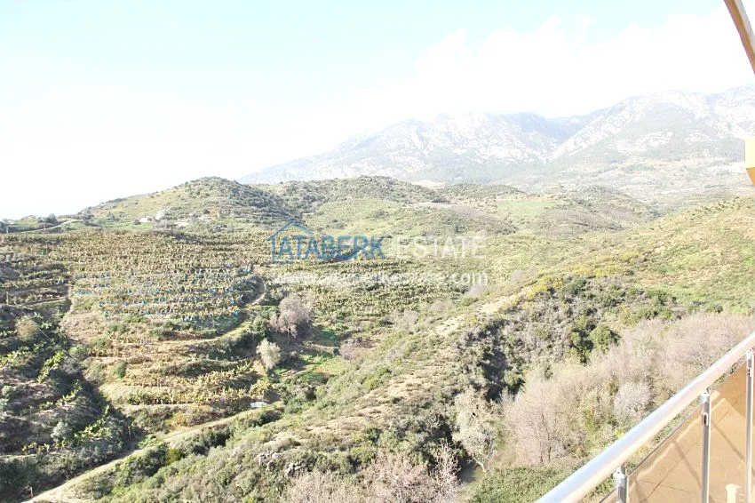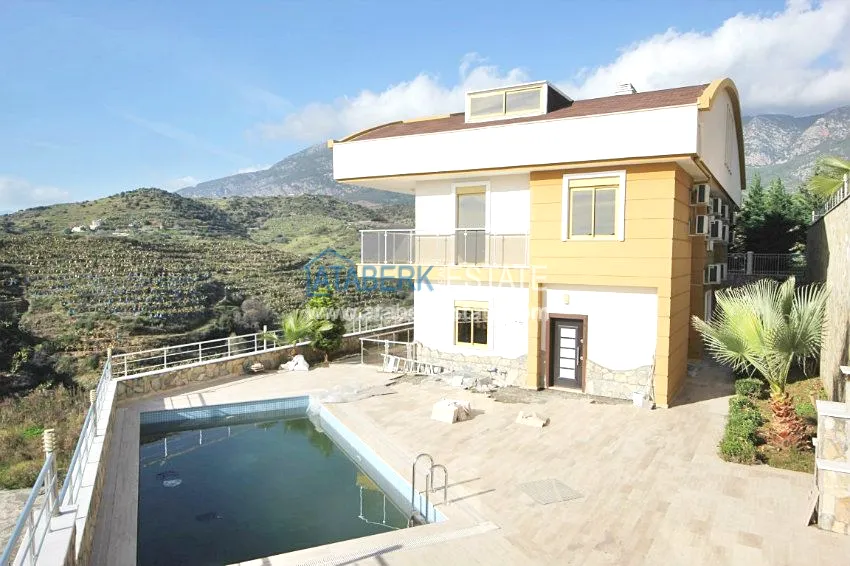 В тихом месте среди природы с красивым видом расположен дом с 4 спальнями. Вилла разделена на два хозяина, с входами с разных сторон. На закрытой территории располагается бассейн. Рядом также расположены дома и виллы, за счет удачного расположения на возвышенности с виллы открывается прекрасный вид на всю Аланию, горы Торос и Средиземное море.