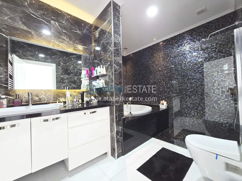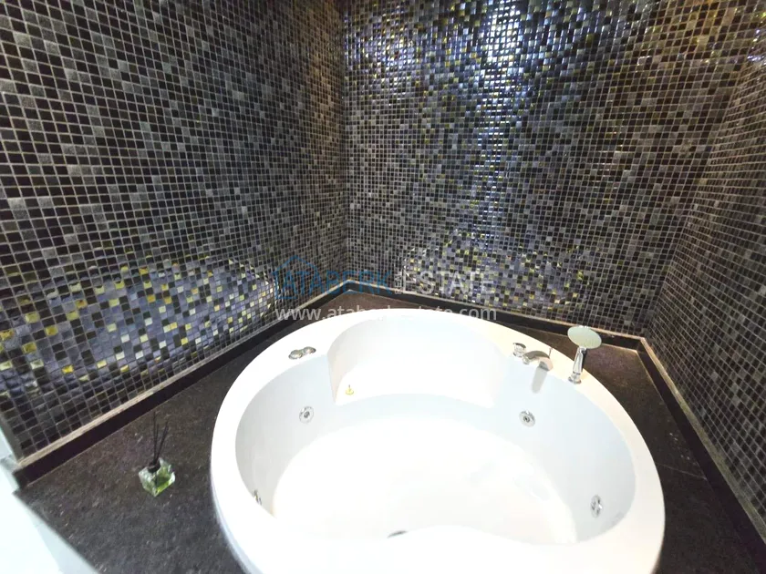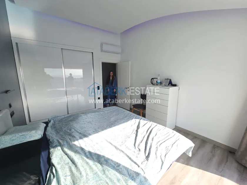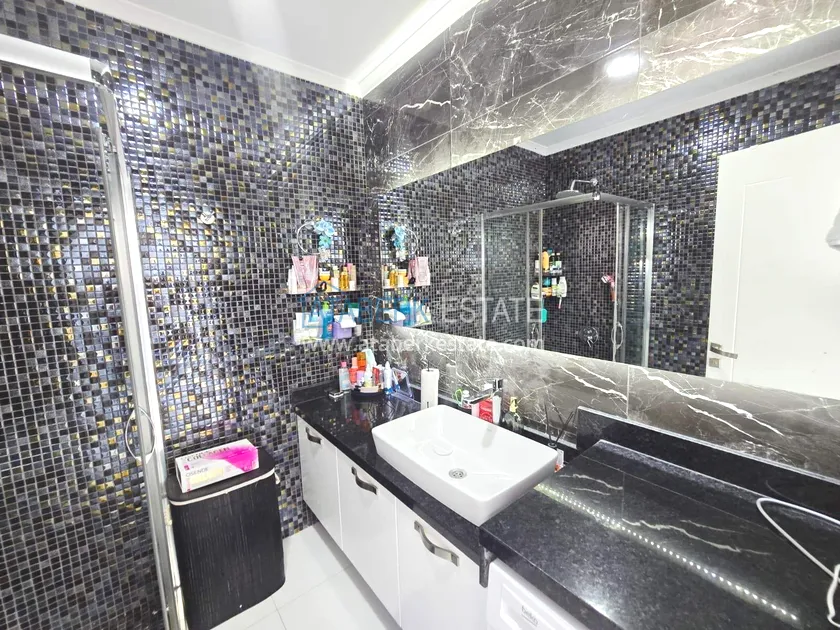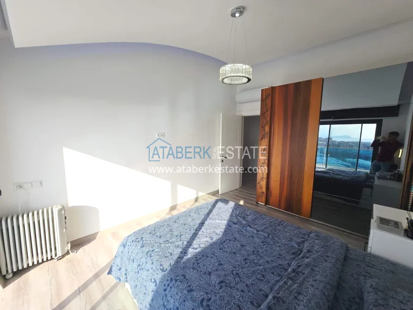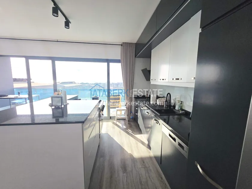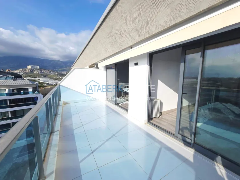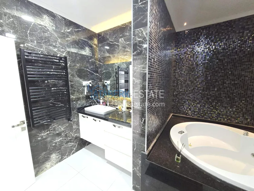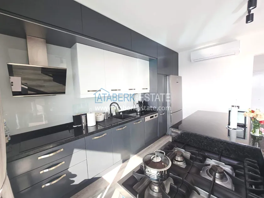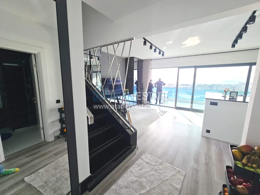 Двухуровневая квартира общей площадью 147 м². В планировке 2+1 предусмотрены просторная гостиная с кухонной зоной, две спальни, два санузла и два больших видовых балкона. На втором уровне расположена терраса с солнцезащитным раздвижным навесом - идеальное пространство для отдыха в любое время дня. В одном из санузлов установлен джакузи. Для дополнительного комфорта предусмотрен подогрев полов в ванных комнатах, электрические полотенцесушители и качественное алюминиевое остекление. Квартира полностью меблирована в люкс-формате: вся мебель, включая кухонный гарнитур, выполнена на заказ с акцентом на качество, эстетику и функциональность. Главное преимущество объекта - впечатляющие панорамные виды на море, горы, крепость Кале, город и окружающие пейзажи. По видовым характеристикам квартира считается одной из лучших в комплексе.