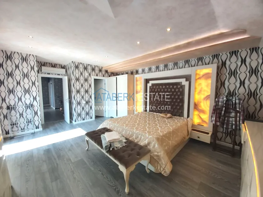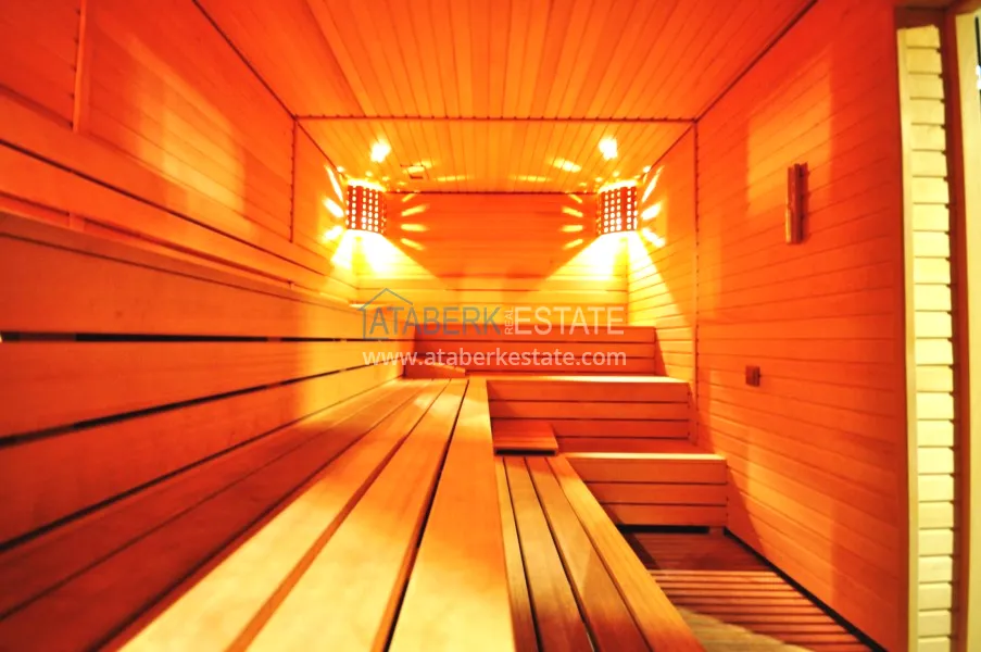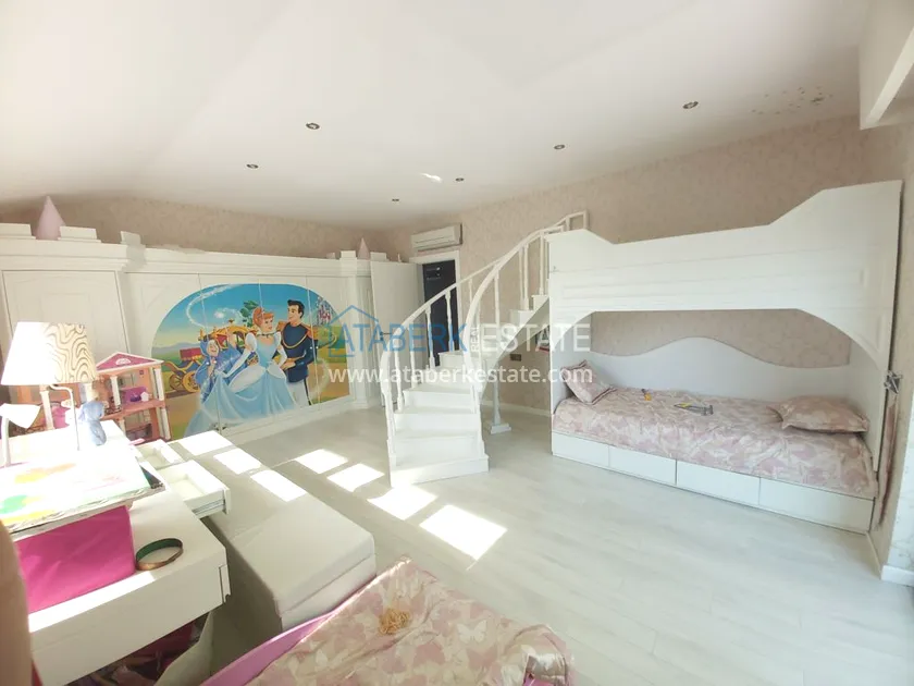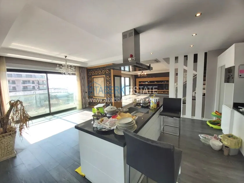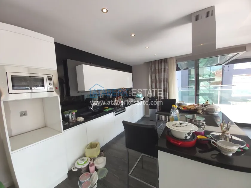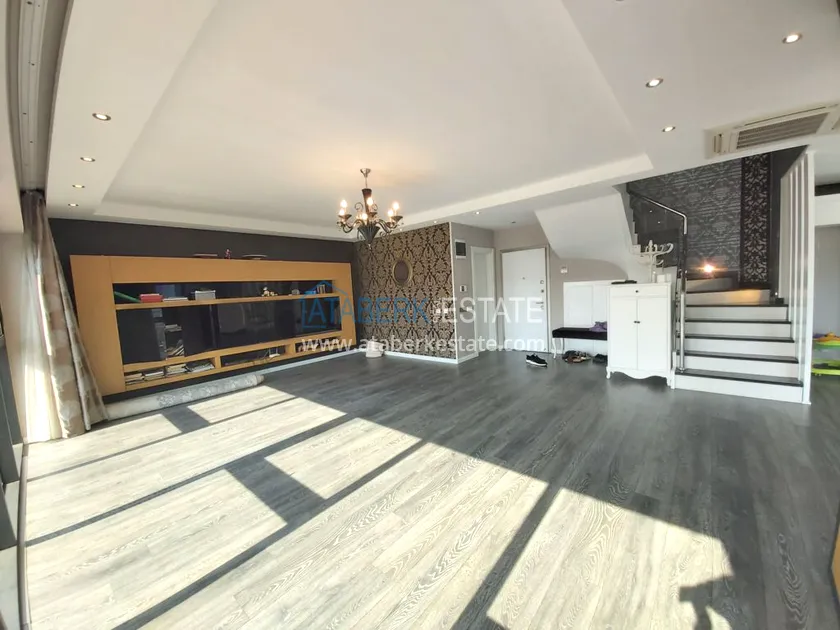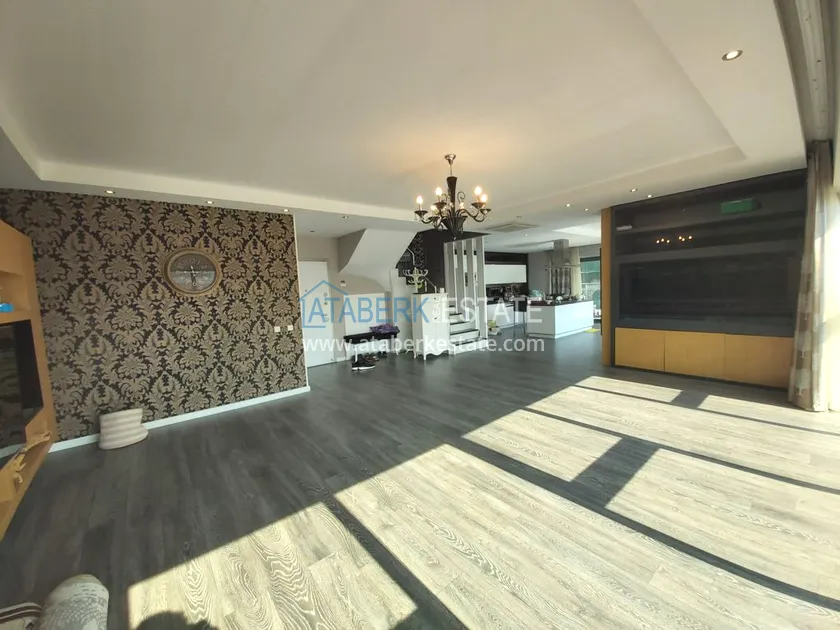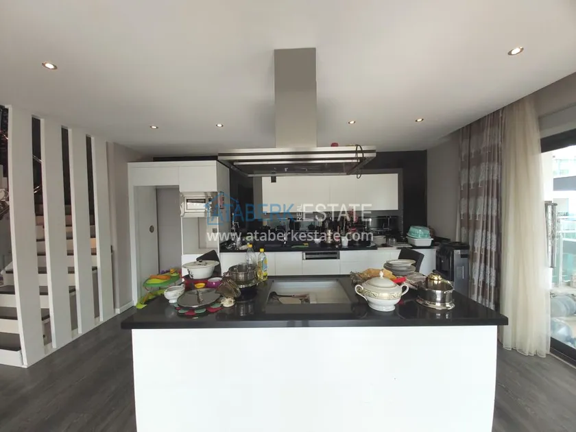 Четырехкомнатные апартаменты занимают два верхних этажа дома, общая площадь составляет 230 м2, имеют планировку 3+1 - гостиная, американского типа кухня, 3 спальни, 2 санузла, личная сауна, джакузи, а также балкон и просторная терраса. Квартира выставлена на продажу в том виде, в котором представлена на фото.