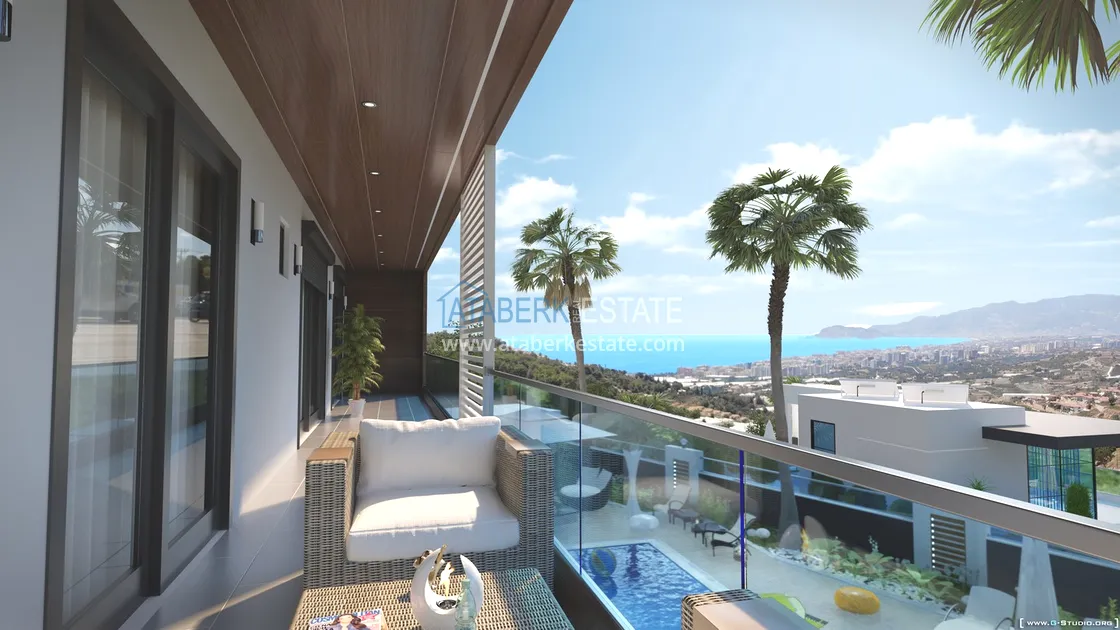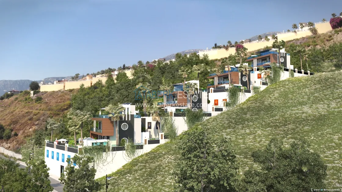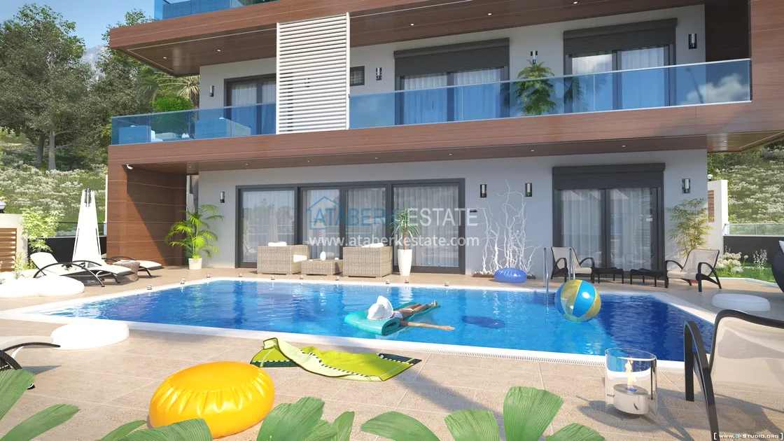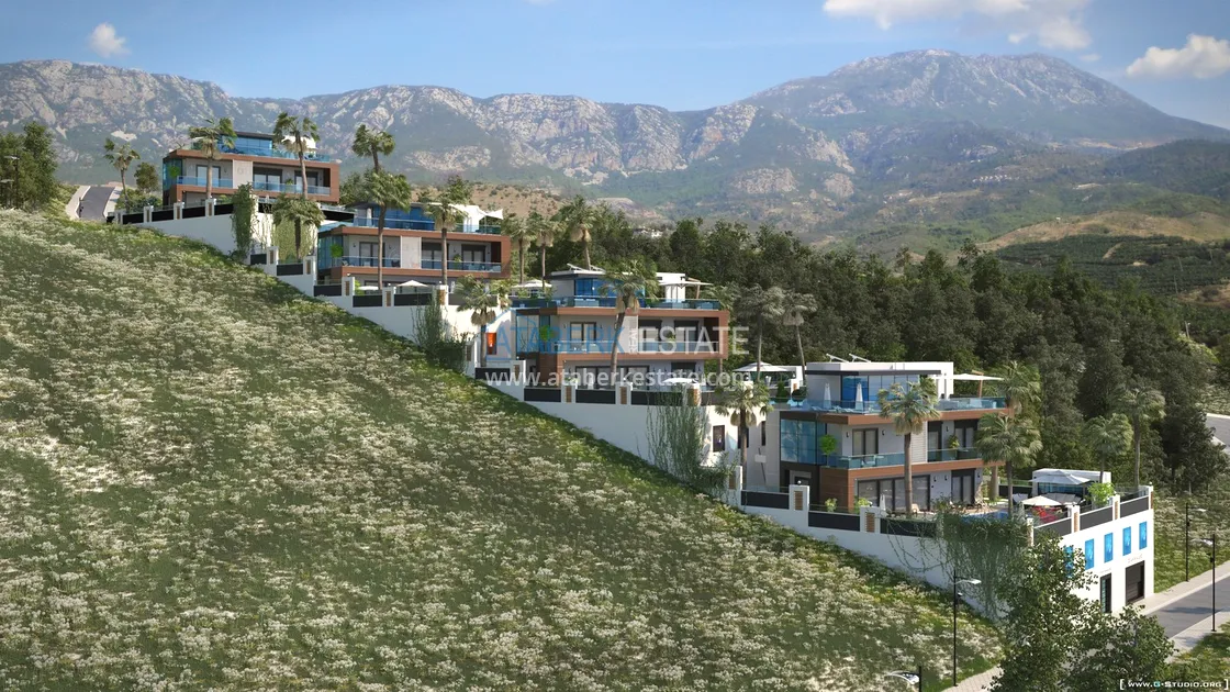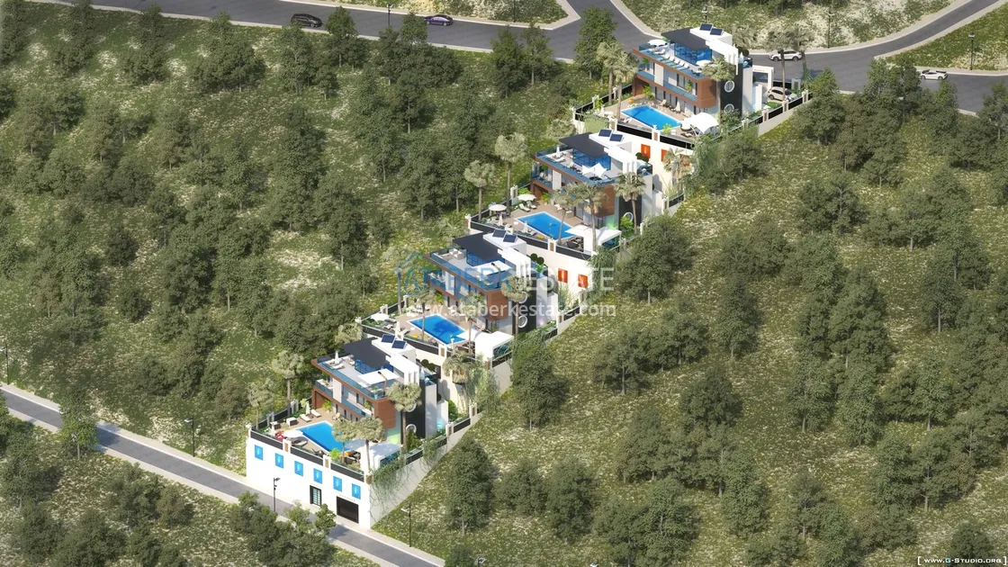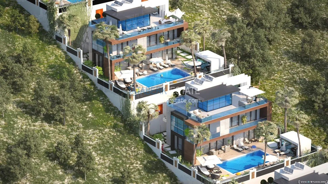 Комплекс включает в себя 4 индивидуальные виллы, каждая со своей территорией в 550 м2, личным бассейном и парковкой. Все виллы видовые, имеют 3 этажа, планировку 5+1 и жилую площадь в 240 м2. Данная планировка предусматривает наличие 5 спальных комнат, гостиной, совмещенной с кухней открытого плана, несколько ванных комнат, а также балконов с роскошными панорамными видами на зеленные окрестности, горы и море. Недвижимость будет сдаваться с полной чистовой отделкой, укомплектованными санузлами, всторенной кухонной мебелью, также будут проведены все коммуникации и полностью установлена вся сантехника.