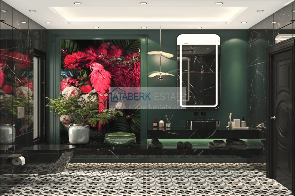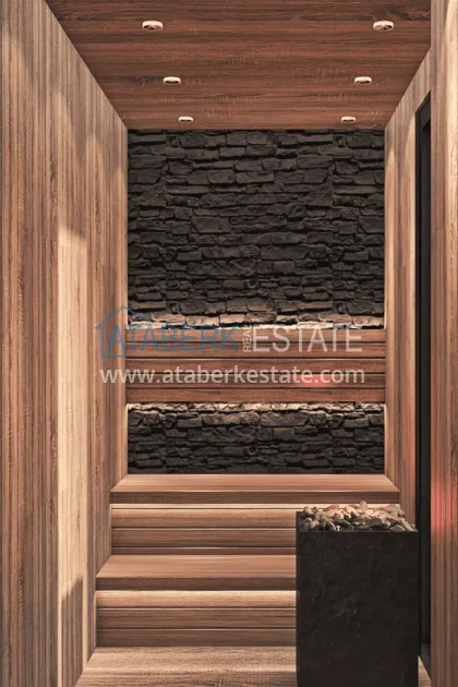 Цокольный этаж (bodrum kat) NET 210 м2 BRUT 272 м2 терраса 62 м2 - техническое помещение, домашний кинотеатр, лифт, крытый бассейн, гостиная - зона отдыха, сауна, хамам, санузел, выход на уличную территорию, где: открытый инфинити бассейн 30 м2, сад и зона отдыха с очагом-барбекю.