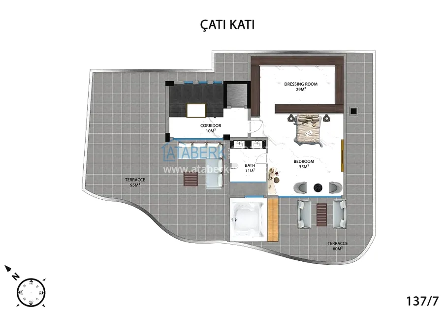3 этаж (çatı arası) NET 107 м2 BRUT 262 м2 – спальня, гардеробная, санузел, джакузи, терраса 115 м2.