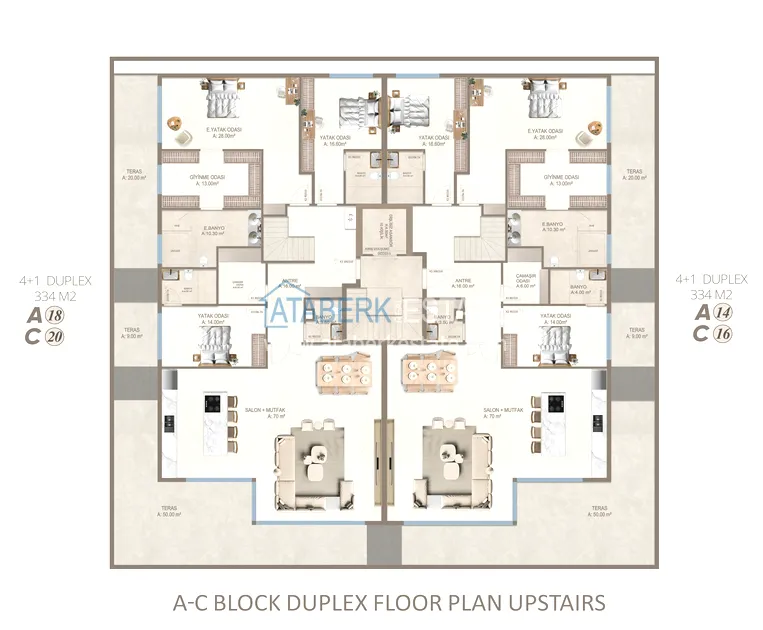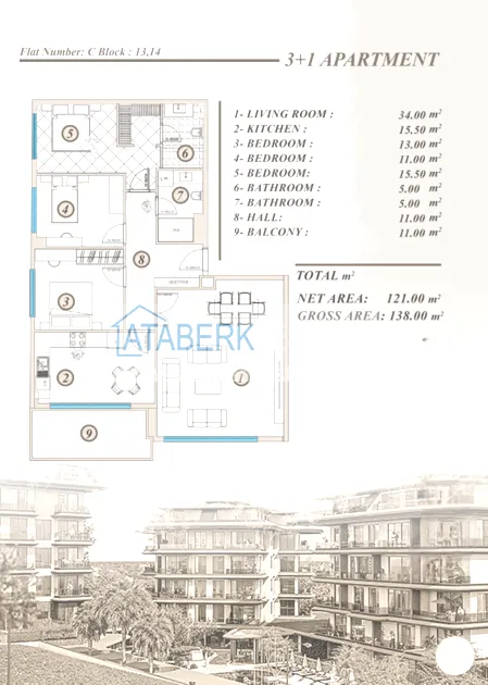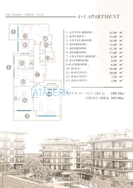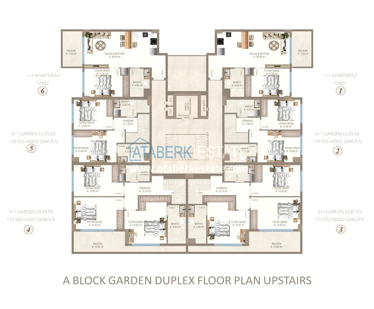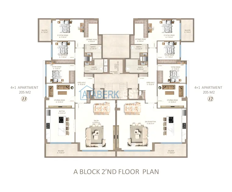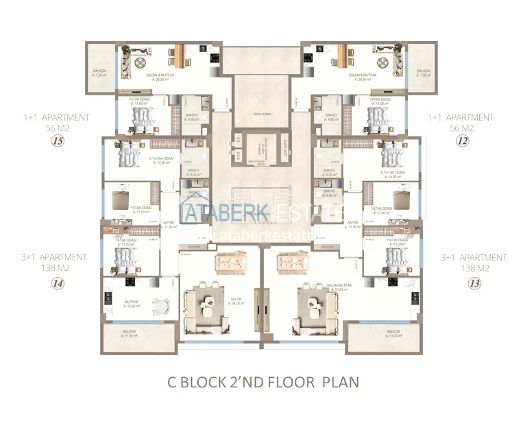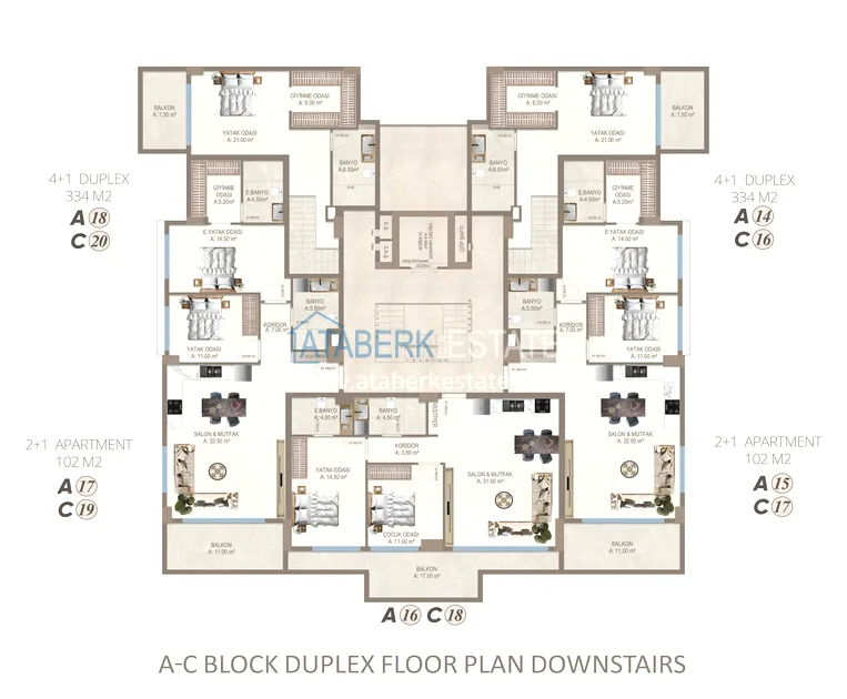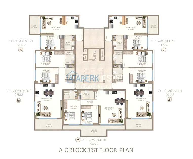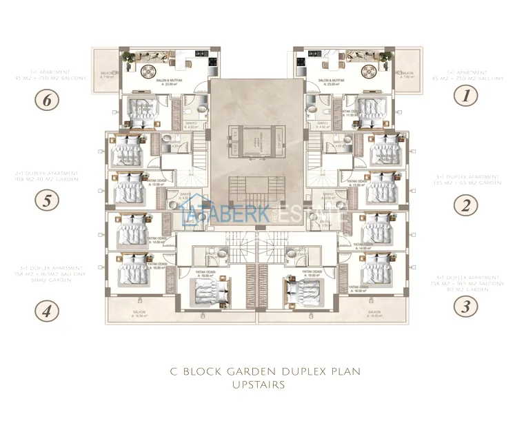 Апартаменты представлены в разнообразных планировках: линейные 1+1, 2+1, 3+1, 4+1, а также дуплексы пентхаусы и садовые 3+1 и 4+1. Квартиры отличаются увеличенными площадями, панорамными окнами, просторными балконами и ощущением света и воздуха в каждом пространстве.