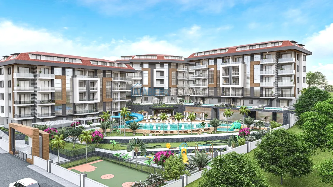 Жилой комплекс будет состоять из трех 5-этажных блоков, комфортабельной территории с хорошей инфраструктурой. Предлагаемая недвижимость угловая, планировки 1+1 площадью 45 м2, этаж расположения первый турецкий, юго-западная и северная сторона. Апартаменты будут сданы с полной чистовой отделкой, укомплектованным санузлом, встроенной корпусной кухонной мебелью. Будут установлены входные и межкомнатные двери, аудиовизуальный домофон, проведено точечное освещение. Напольное покрытие из керамической плитки.