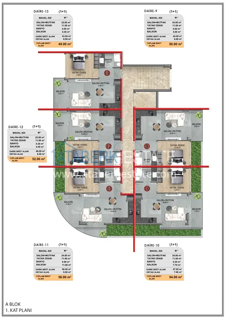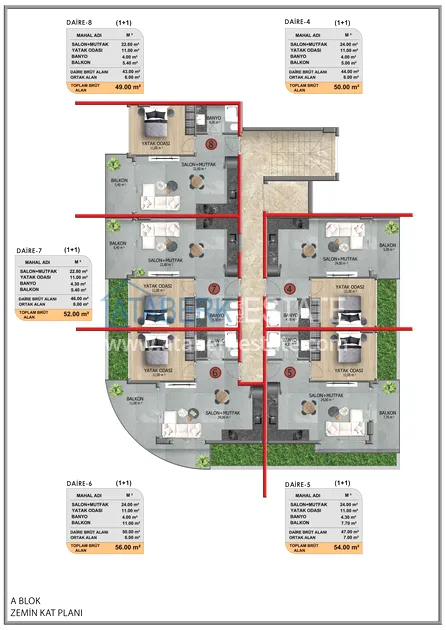Всего в проекте 46 апартаментов планировки 1+1 площадью от 44 м2, а также пентхаусы и садовые дуплексы планировки 2+1 площадью от 95 м2 с личным бассейном и террасой. В стоимость включено: полная чистовая отделка, кухонная мебель, качественное напольное покрытие и укомплектованные санузлы.