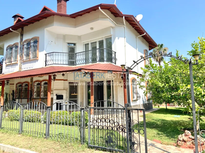 Вилла находится на территории жилого комплекса, который построен в красивом месте на горной возвышенности у русла реки Дим-Чай, совсем недалеко от спального района Алании, Кестель. Да, коттеджный комплекс находятся дальше от центра и моря, на расстоянии не менее двух километров, но тишина и покой обеспечены. Комплекс располагает большой территорией и собственной инфраструктурой. Айдат составляет 1000 лир в месяц. Площадь дома составляет 195 м2, планировка 4+1 – гостиная, частично отдельная кухня,4 спальни, 2 ванные комнаты, гостевой санузел, балкон и терраса.