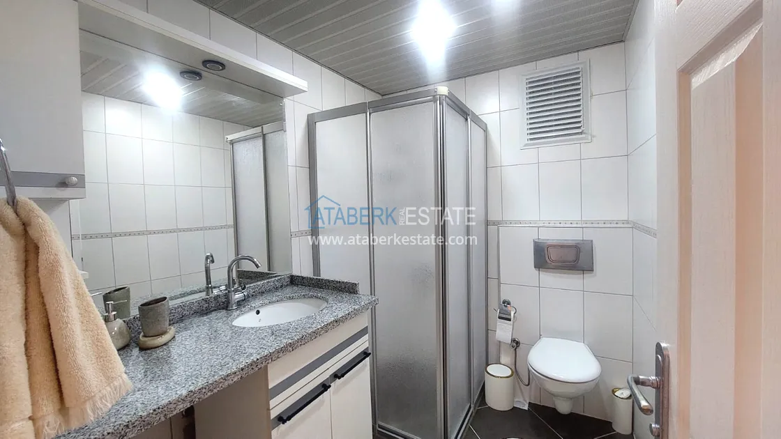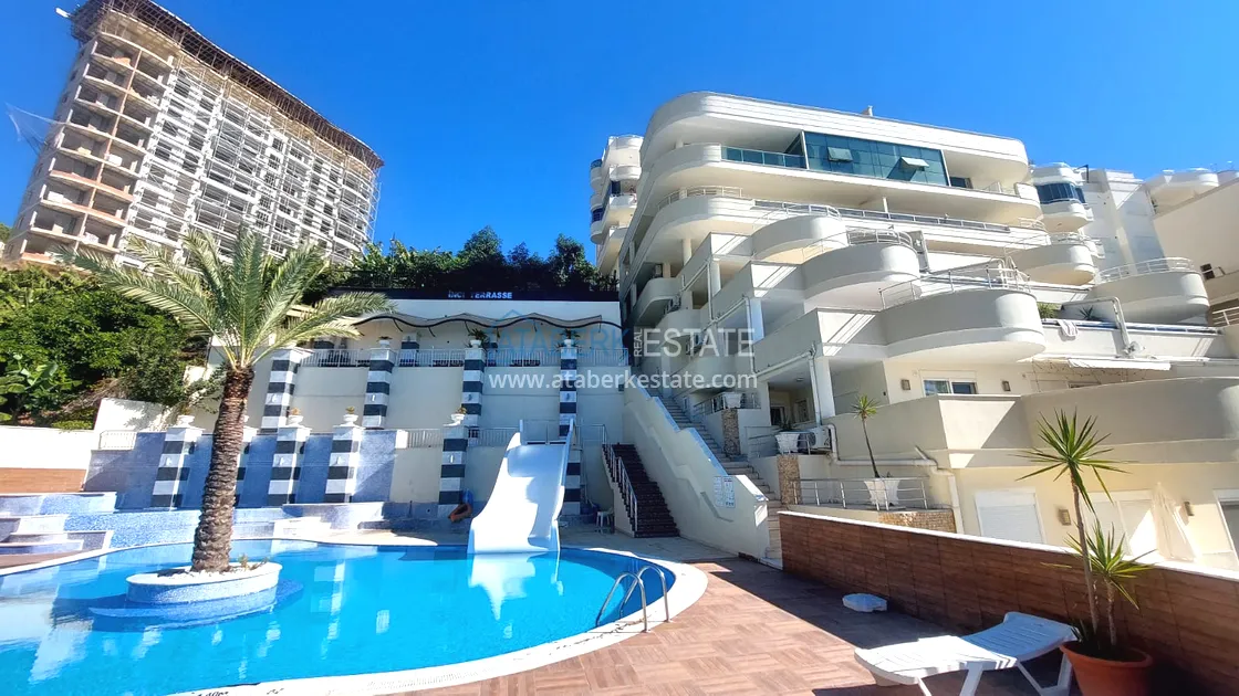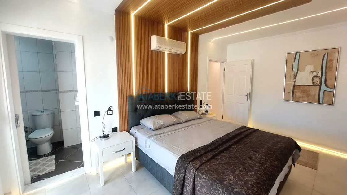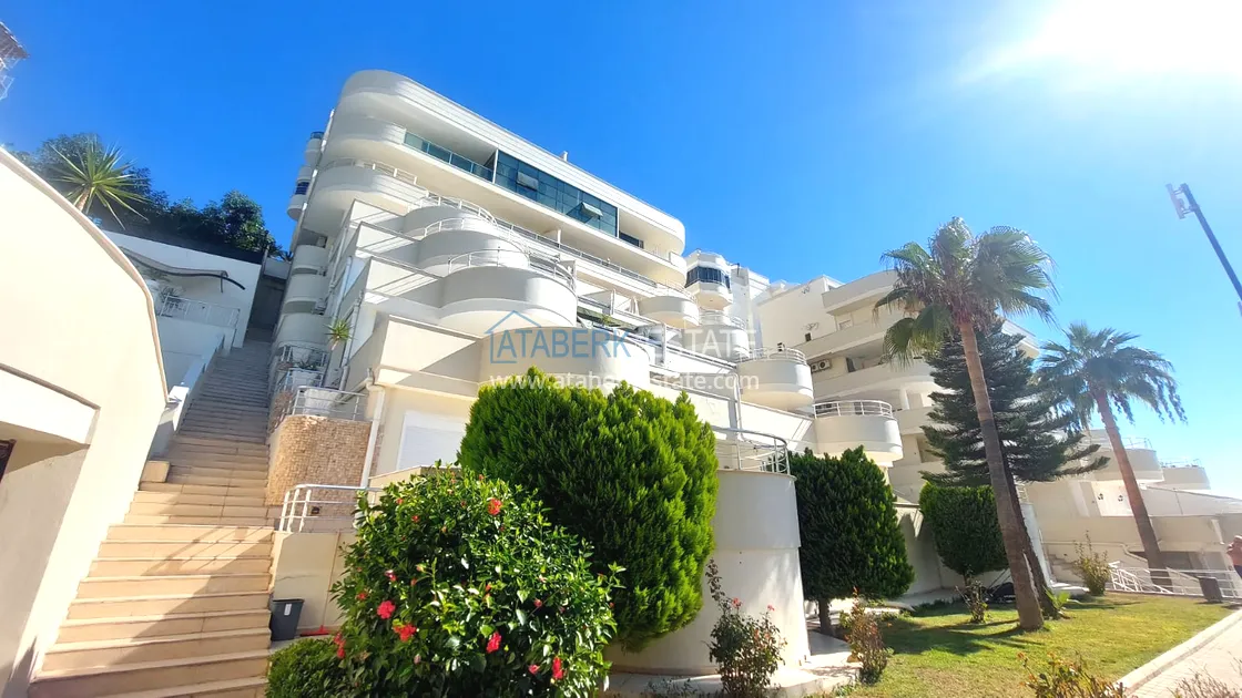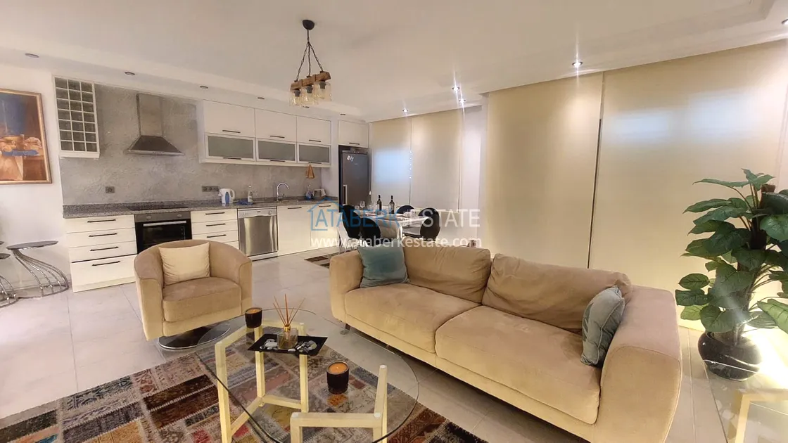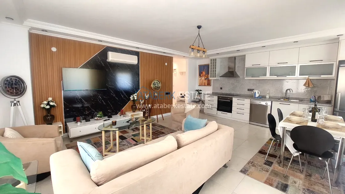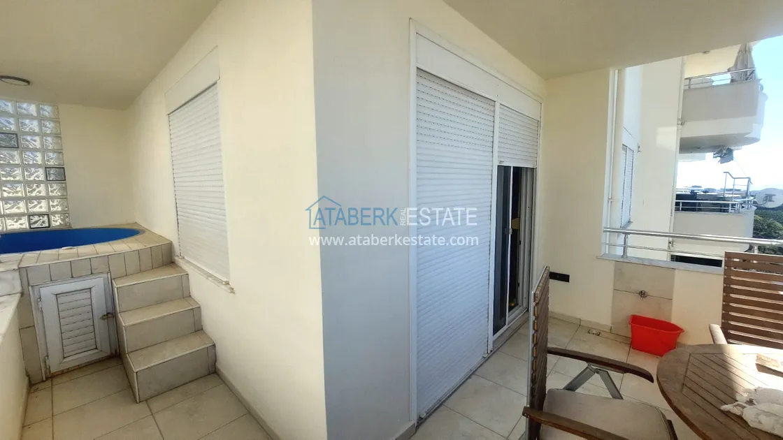 Квартира планировки 2+1 площадью 130 м² расположена на третьем этаже. В ней предусмотрена гостиная с кухней открытого типа, две спальни, две ванные комнаты и два балкона. С просторных балконов открываются захватывающие панорамы на море и горы, а на одном из них установлено джакузи — идеальное место для отдыха на свежем воздухе. Апартаменты меблированы, интерьер выполнен в классическом стиле, а большое количество окон наполняет пространство естественным светом.