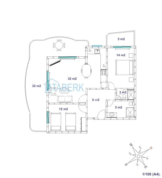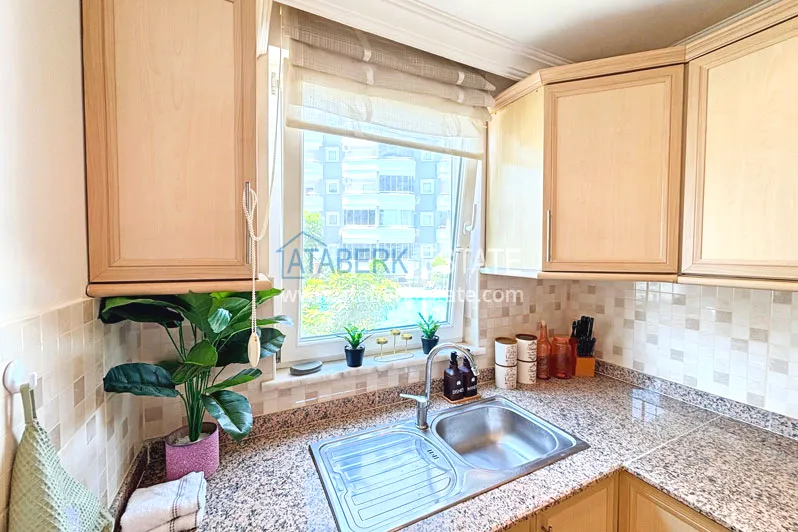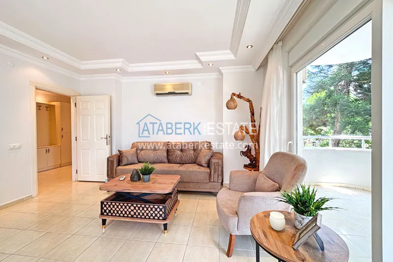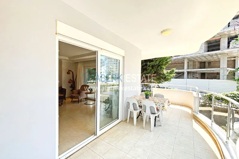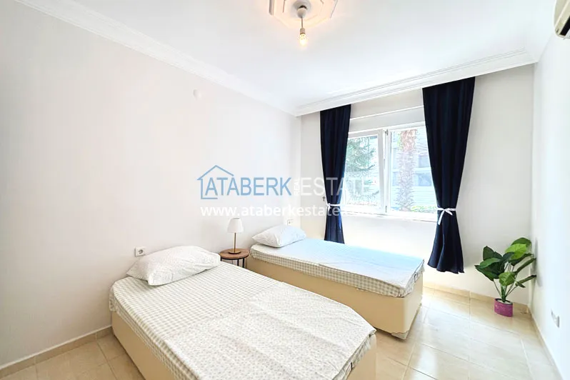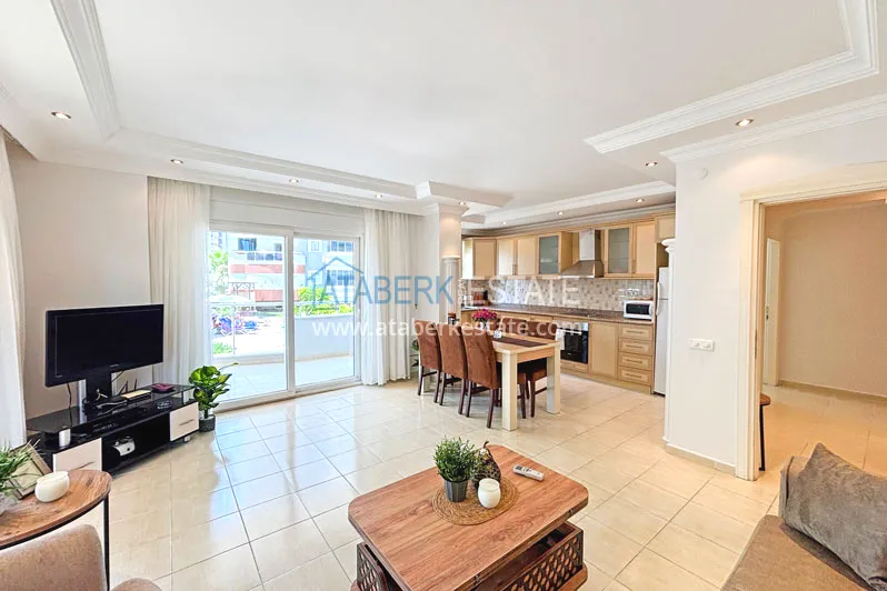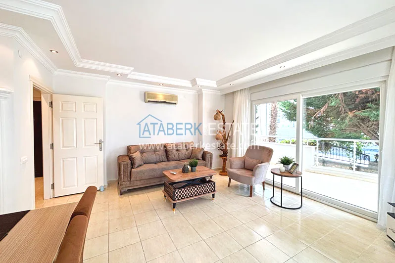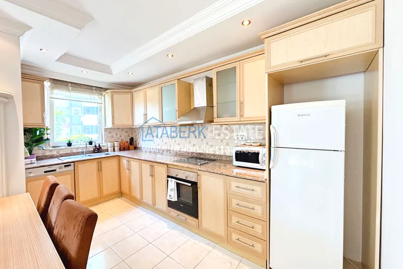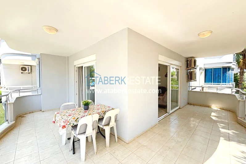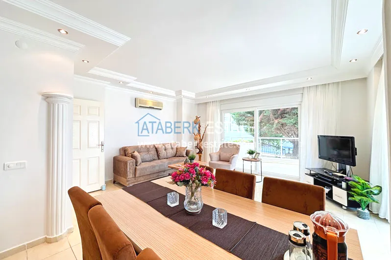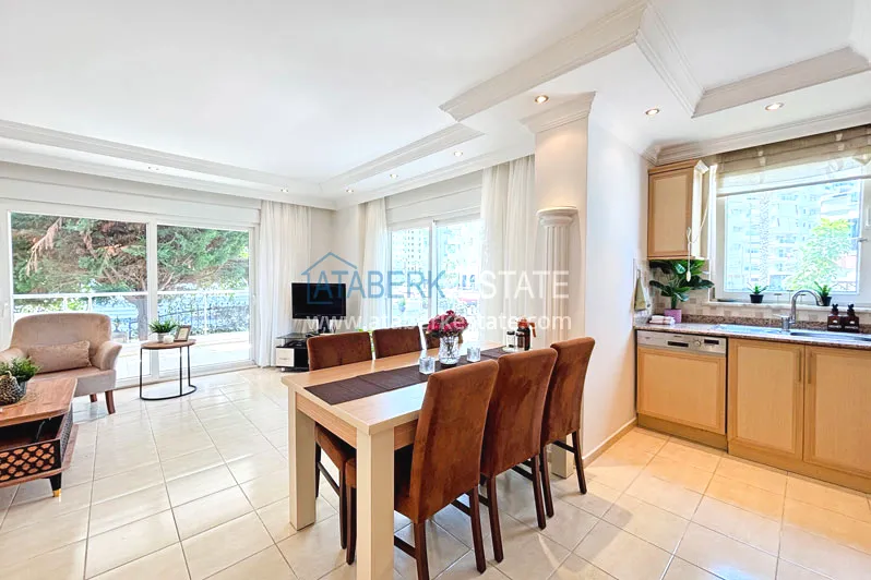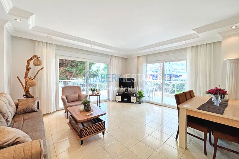 Квартира планировки 2+1 общей площадью 125 м² расположена на первом этаже. Планировка включает гостиную, кухню американского типа, две спальни, две ванные комнаты и два балкона, что делает пространство особенно удобным для семьи или длительного проживания. Квартира предлагается с мебелью, помещения просторные и хорошо зонированные, с ощущением воздуха и свободы, которое редко встречается в стандартных городских форматах.