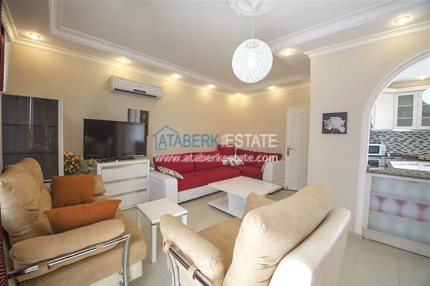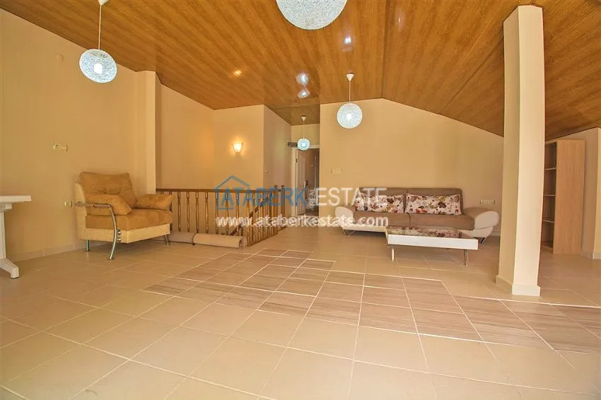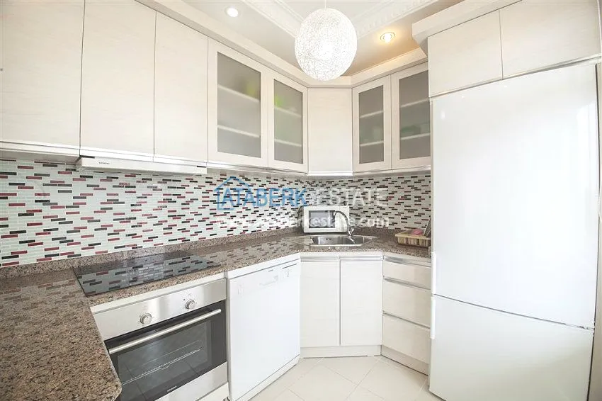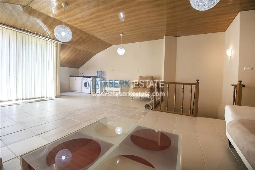 Общая площадь двухуровневых апартаментов 3+2 180 м2: три спальных комнаты, две гостиных, одна из которых совмещенная с кухней, отгороженной небольшой аркой, что нисколько не мешает приятному разговору с гостями. В квартире две ванные комнаты, а на верхнем уровне есть терраса-балкон, где можно с удовольствием проводит время и круглогодично принимать солнечные ванные. Апартаменты меблированы и установлена необходимая бытовая техника.