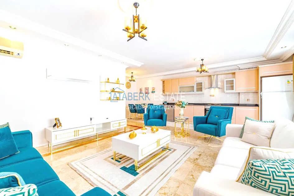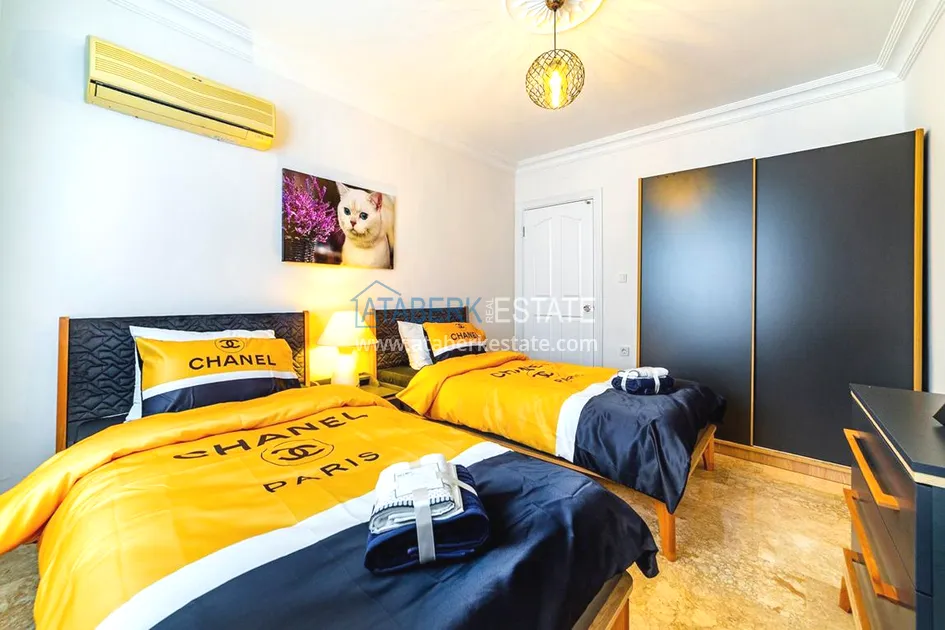 На продажу выставлены трехкомнатные апартаменты расположенные на 6 этаже, окна смотрят на юго-запад. Квартира теплая, светлая планировки 2+1, общая площадь 120 кв. м, продается со всей мебелью и бытовой техникой, как на фото. Планировка включает: салон, совмещенный с кухней открытого плана, две спальни, две ванные комнаты и два балкона с очень красивым видом на море и городские окрестности.