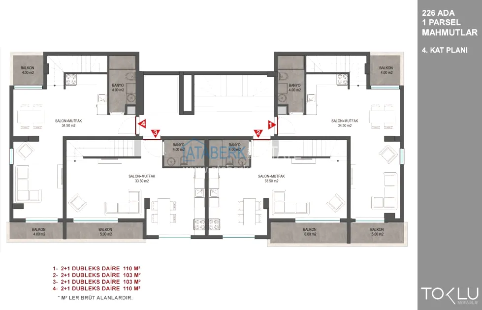 Предложены квартиры планировки 1+1 от 50 до 55 м2 и двухуровневые пентхаусы 2+1 от 103 до 110 м2.