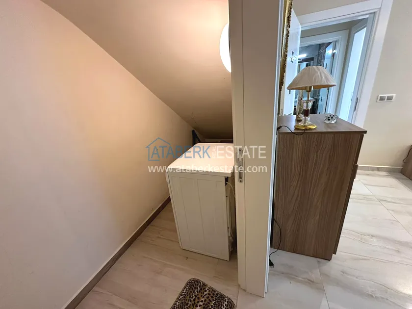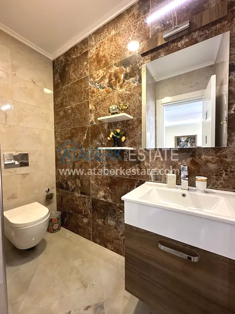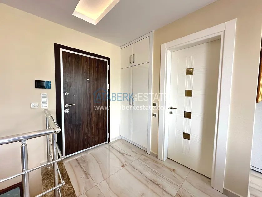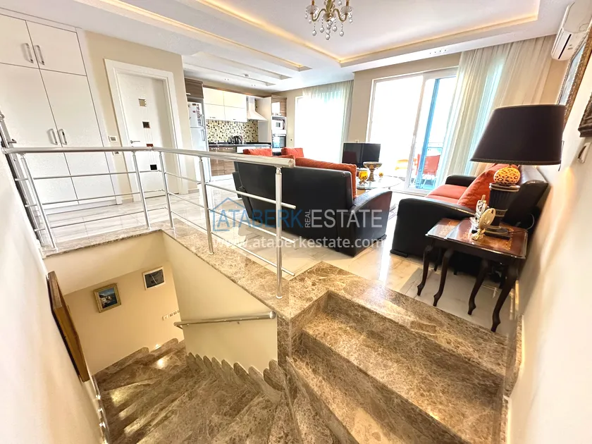Предлагаемый дуплекс имеет перевёрнутую планировку – входной этаж находится на верхнем уровне, где расположены просторный салон, кухня американского типа, санузел и балкон. На втором нижнем уровне находятся две спальни, ванная комната и ещё один балкон. Общая площадь недвижимости составляет 135 м². Квартира полностью укомплектована мебелью и техникой, все комнаты оснащены кондиционерами. Ориентация на южную и восточную стороны обеспечивает много естественного света в течение дня и красивый вид на природу и городские окрестности.