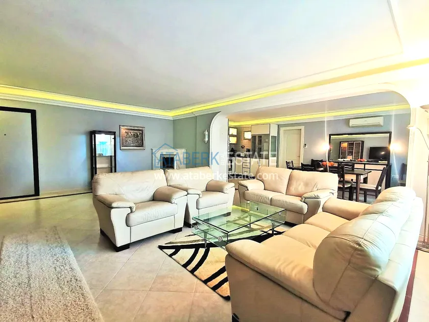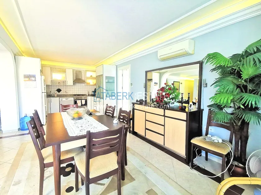 Квартира находится на втором этаже и ориентирована на восточную сторону, что обеспечивает естественное освещение в течение дня. Общая площадь составляет 145 м², планировка 3+1 включает просторную гостиную, открытую кухню с обеденной зоной, три уютные спальни, три санузла и два застекленных балкона. Недвижимость продается с мебелью и техникой, как представлено на фото, что позволяет сразу же въехать и наслаждаться жизнью.