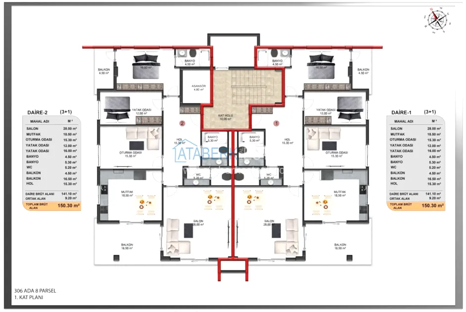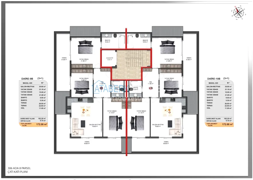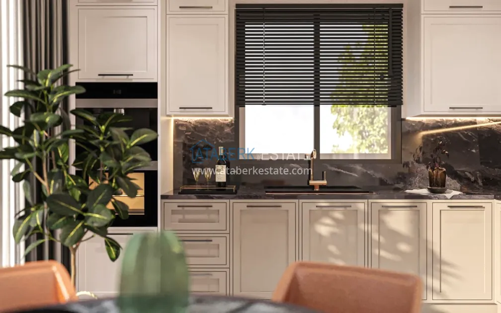 Комплекс состоит из одного 5-этажного дома – 4 жилых, мансардный и коммерческий. Есть паркинг на 6 авто. Всего в доме 12 апартаментов. К продаже представлены квартиры планировки 2+1 площадью 130,6 м2, линейные 3+1 площадью 150,3 м2 и пентхаус-дуплексы планировки 3+1 площадью 172,2 м2. Комплектация квартир: 60*20 гранитное напольное покрытие, лакированный кухонный гарнитур, изолированные окна с двойным стеклопакетом, лакированные межкомнатные двери, стальная дверь с двойным глазком, а также полностью укомплектованные санузлы.