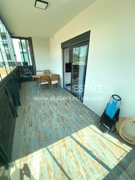 Квартира расположена на 1 этаже, вид на территорию комплекса, общая площадь составляет 90 м2. Планировка 2+1 подразумевает наличие салона, кухни открытого плана, двух спальных комнат, одной ванной комнаты и двух балконов, один из которых застеклен. В стоимость входит вся мебель и бытовая техника, всё как на фото.
