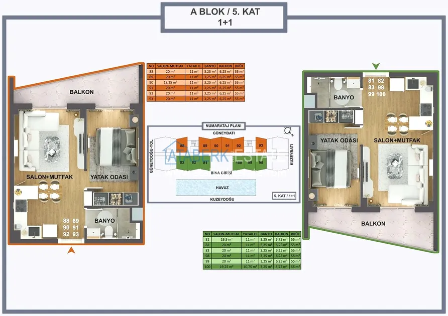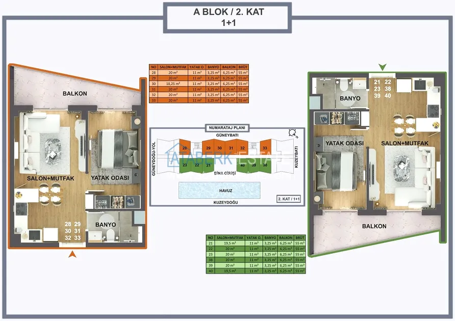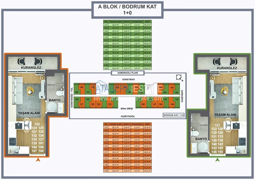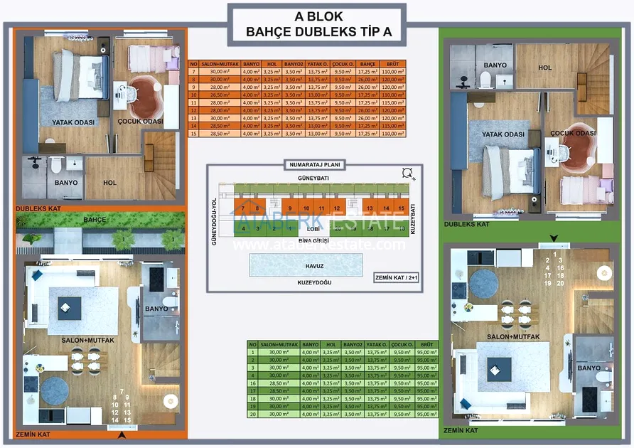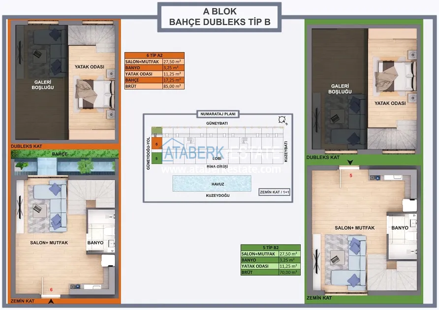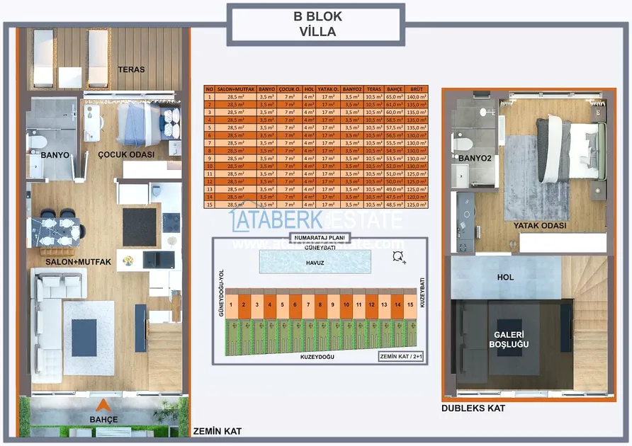 Проект реализуется на участке площадью 6 404 м2, будет состоять из двух блоков на 165 объектов недвижимости – квартиры повышенного комфорта и лофт-виллы, планировки: 1+0, 1+1, 2+1, садовые дуплексы. Площадь апартаментов варьируется от 35 до 120 м2, площадь вилл от 120 до 140 м2. В стоимость включено: полная и качественная чистовая отделка, автоматические жалюзи антрацитового цвета, антрацитовые оконные профили, декоративные подвесные потолки, гардеробная, инфраструктура для проводки газа и кондиционеров, лакированная стальная дверь, лакированные внутренние двери, островная кухня с гранитной мойкой и встроенной бытовой техникой из трех приборов, а также столешница из кварцевого композита.