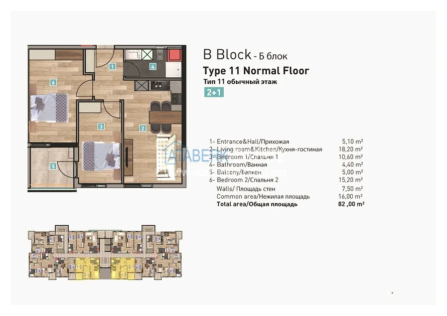 Предлагаемая квартира имеет планировку 2+1 и расположена на третьем этаже. Общая площадь составляет 82 м2. Гостиная совмещена с кухней открытого типа, две изолированные спальни, балкон, прихожая и ванная комната. Квартира передаётся с полной чистовой отделкой высокого класса: стальные входные двери, межкомнатные двери, точечное освещение, на полу ламинат и керамогранит, ПВХ-окна с двойным остеклением и электрошторами, встроенные шкафы и укомплектованный санузел. Кухонный гарнитур оснащён бытовой техникой Siemens (плита, духовой шкаф, вытяжка), а в каждой комнате установлен кондиционер. Также предусмотрено газовое отопление с установленным котлом.