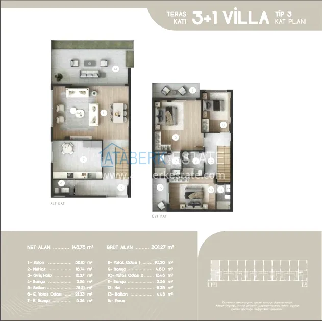 К продаже представлены квартиры планировки 2+1 и 3+1, садовые дуплексы 3+1, а также двухэтажные вилл 3+1 и 4+1. Высокие потолки до 3 м и просторные помещения. Все квартиры и виллы будут оснащены центральным газовым отоплением и индивидуальными кондиционерами.